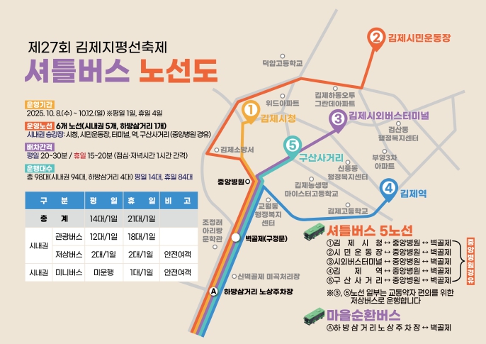 올해 지평선축제 기간에 셔틀버스는 평일 14대, 주말 20대를 15분에서 30분 간격으로 운행하고, 중앙병원을 경유지로 하여 김제시청, 시민운동장, 버스터미널, 김제역, 구산사거리부터 벽골제까지 오가는 총 5개 노선으로 운행할 예정이다.