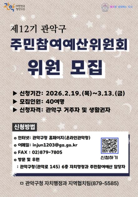 이에 따라 구는 주민참여예산제를 새롭게 이끌어갈 ‘제12기 관악구 주민참여예산위원회’ 위원을 오는 3월 13일까지 모집한다. 이번 제12기 위원회에서는 약 40명의 신규 위원을 선발할 계획이다.