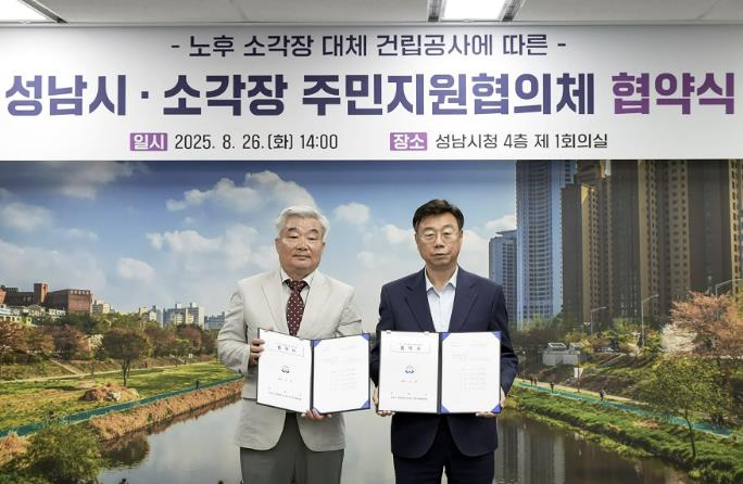 | ▲ 2025년 8월 26일 시청 제1회의실에서 열린 ‘노후 소각장 대체 건립 공사 협약식’ 때 신상진 성남시장(오른)과 김재성 성남시 환경에너지시설 주민지원협의체 위원장(왼) |