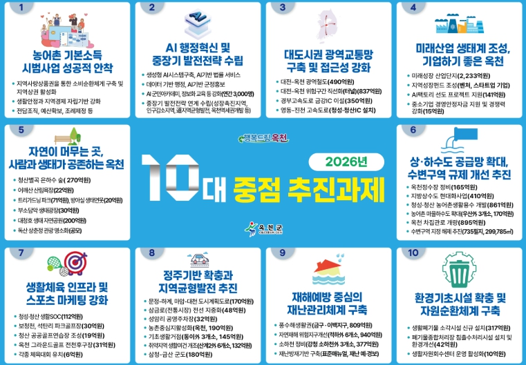 [메이저뉴스]옥천군이 26일 2026년 군정 운영의 핵심 방향을 담은 10대 중점 추진과제를 발표하고, 군민 삶의 질 향상과 지속가능한 지역성장을 위한 정책 추진에 나선다.