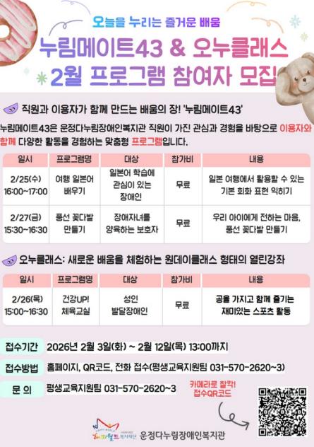 [메이저뉴스]파주시 운정다누림장애인복지관은 참여형 평생학습 프로그램 ‘누림메이트43’을 운영하며, 정규 강좌로는 담기 어려운 소규모 학습 수요를 반영한 생활 밀착형 배움을 실천하고 있다.