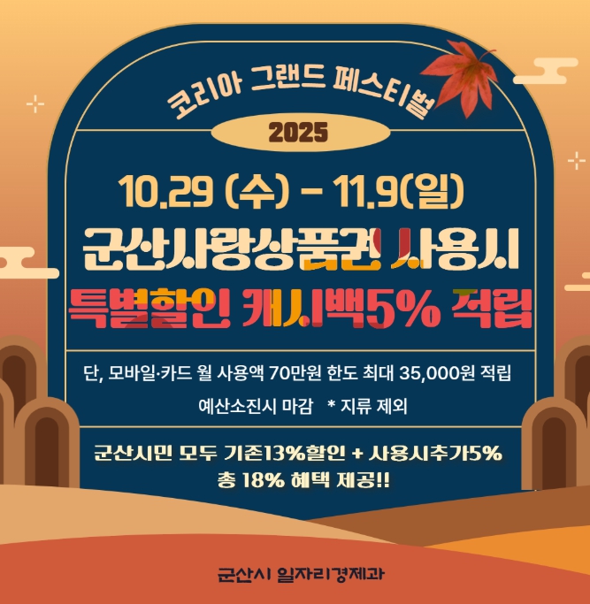 [메이저뉴스]군산시가 오는 29일부터 11월 9일까지 12일간 정부가 추진하는 ‘코리아 그랜드 페스티벌’에 참여해 군산사랑상품권 이용자에게 파격적인 추가 혜택을 제공한다.