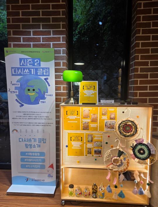 ▲ ‘다시 쓰기 클럽 시즌 2’ 참여자들이 폐자원으로 만든 창작물을 손기정문화도서관 라운지에서 전시하고 있다.