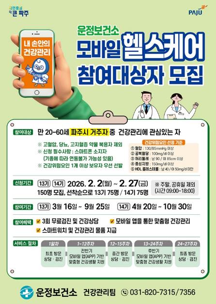 [메이저뉴스]파주시 운정보건소는 시민의 자가 건강관리 능력 향상과 만성질환 예방을 위해 2026년 ‘모바일 헬스케어 사업’참여자를 모집한다.