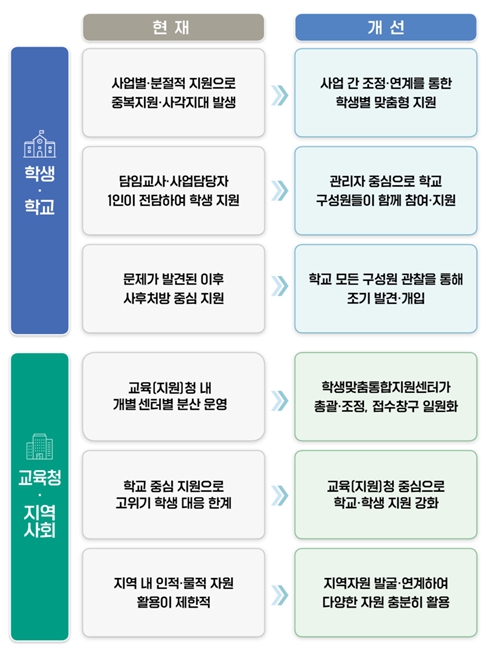 그동안 기초학력 지원, 심리·정서 지원, 진로 등 여러 사업을 통해 학생들을 지원해 왔으나, 관련 사업 간·담당자 간 연계 없이 개별적·분절적으로 지원이 진행되어 학생의 복합적인 어려움을 해소하는 데 한계가 있었다. 이에, 학교 안팎의 다양한 구성원들이 학생을 관찰하며 조기에 문제를 발견하고, 함께 논의하여 학생을 통합적으로 지원하기 위한 「학생맞춤통합지원법」이 지난해 1월 제정됐으며, 2026년 3월 1일부터 시행될 예정이다.