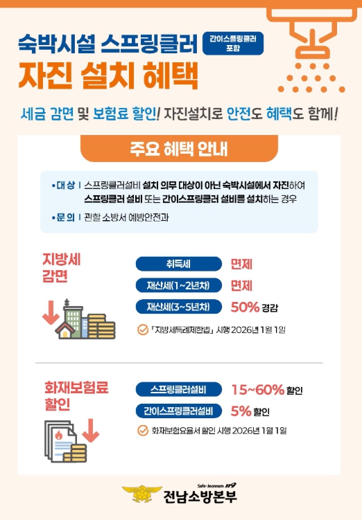 [메이저뉴스]전라남도소방본부는 2026년 1월 1일부터 숙박시설이 자발적으로 스프링클러 등 소방시설을 설치할 경우 지방세 감면과 화재보험료 할인 혜택을 제공한다고 밝혔다.