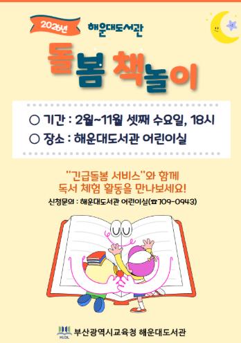 [메이저뉴스]부산광역시립해운대도서관은 2월부터 11월까지 매월 셋째 수요일 오후 6시 도서관 어린이실에서 긴급돌봄 서비스와 연계한 ‘돌봄 책놀이’ 프로그램을 운영한다고 밝혔다.