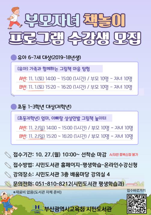 [메이저뉴스]부산광역시립시민도서관은 다음달 1일부터 이틀간 시민도서관 배움마당 강의실에서 학부모와 자녀 80명을 대상으로 ‘하반기 부모자녀 프로그램’을 운영한다.