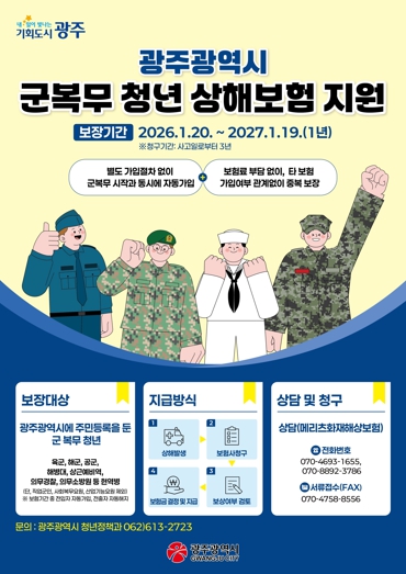 [메이저뉴스]광주광역시는 지난해에 이어 올해에도 광주 청년들이 국방의무에 전념할 수 있도록 ‘군복무 청년 상해보험 가입’을 지원한다.