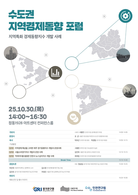 [메이저뉴스] 인천연구원은 2025년 10월 30일 오후 2시부터 정동1928 아트센터 컨퍼런스룸에서 “지역특화 경제동향지수 개발 사례”를 주제로 '수도권 지역경제동향 포럼'을 개최한다.