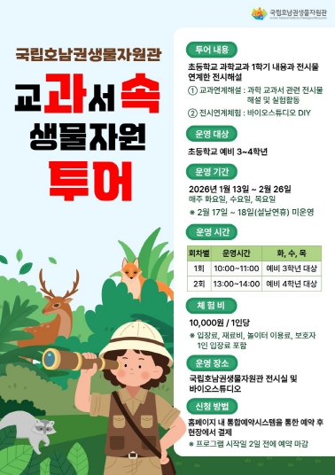 [메이저뉴스]기후에너지환경부 산하 국립호남권생물자원관은 겨울방학을 맞이하여 예비 초등학교 3학년부터 4학년을 대상으로 교과서에 나오는 생물을 전시관에서 직접 만나보는 프로그램인 ‘교과서 속 생물자원 투어’를 1월 13일부터 2월 26일까지 운영한다고 밝혔다.