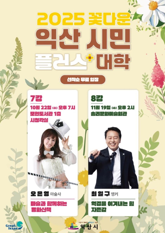 익산시는 오는 22일 오후 7시, 모현시립도서관 시청각실에서 '꽃다운 익산시민+(플러스)대학 공개강좌'를 개최한다고 20일 밝혔다.