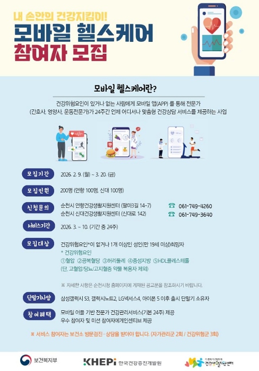 [메이저뉴스]순천시는 ICT 기반 공공형 건강관리서비스인 ‘2026년 보건소 모바일 헬스케어 사업’ 참여자를 모집한다고 밝혔다.