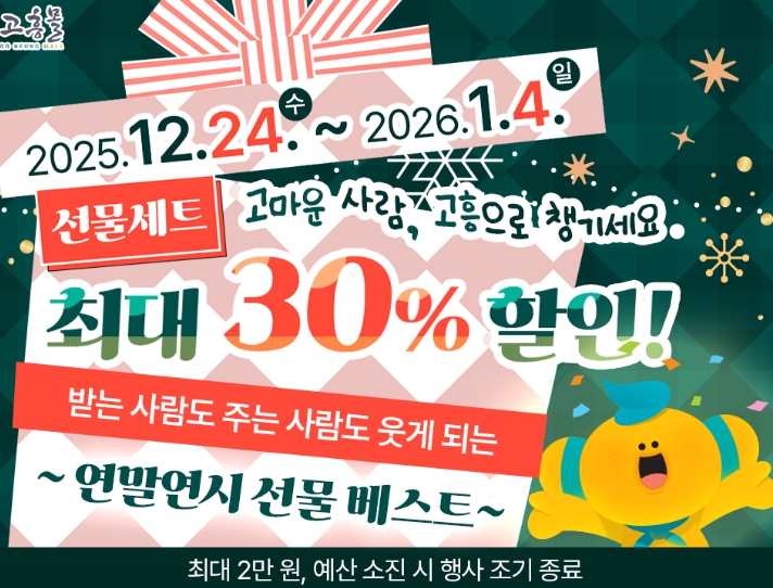 [메이저뉴스]고흥군이 운영하는 온라인 농수축특산물 쇼핑몰 ‘고흥몰’이 연말연시를 맞아 2026년 1월 4일까지 ‘고마운 사람, 고흥으로 챙기세요 – 연말연시 선물 베스트’ 기획전을 진행한다.