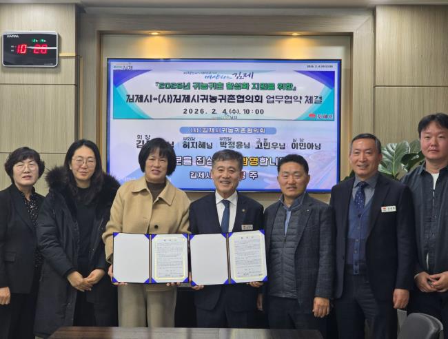 정성주 김제시장은 “이번 협약은 귀농귀촌 정책을 보다 전문적이고 체계적으로 추진하기 위한 중요한 발판”이라며, “귀농귀촌인이 김제에서 새로운 삶을 시작하고 안정적으로 정착할 수 있도록 지속적인 지원과 정주여건 개선에 힘쓰겠다”고 밝혔다.