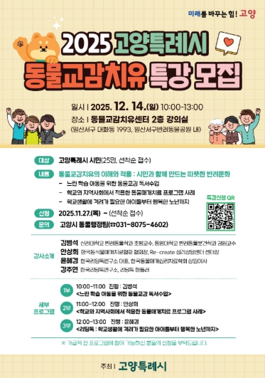 이번 특강은‘동물교감치유의 이해와 적용 : 시민과 함께 만드는 따뜻한 반려문화’를 주제로 12월 14일 오전 10시부터 오후 1시까지 열리며, 시민들이 동물교감치유를 보다 쉽게 이해하고 일상 속에서 활용할 수 있도록 총 3부로 나눠 체계적으로 진행된다.