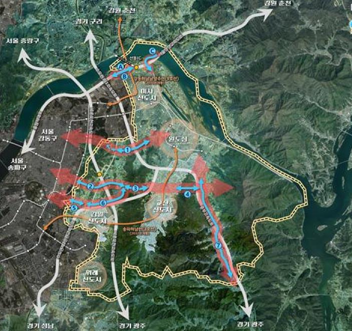 [메이저뉴스]하남시가 5개의 광역철도망 계획에 이어 7개의 광역도로망 확충을 본격적으로 추진하며 명실상부한 ‘서울 30분 도시’, 수도권 동부 교통 허브로의 도약을 눈앞에 두고 있다. 교산신도시 광역교통개선대책의 일환으로 한국토지주택공사(LH), 경기주택도시공사(GH)가 총 3,267억 원(광역교통개선대책 기준)을 투입하여 시행하는 7개 광역도로망 사업은 광역교통개선대책 수립 당시 하남시의 적극적인 협의를 통해 반영된 대규모 프로젝트다. 하남시는 과거 신도시 조성 과정에서 겪었던 ‘선(先) 입주, 후(後) 교통’의 불편을 반복하지 않기 위해 계획 수립 단계부터 적극적으로 참여했으며, 현재 신도시 추진단(T/F)을 통해 철도와 도로망 계획을 통합 관리하며 LH, GH 등 관계기관과 함께 속도감 있게 사업을 추진하고 있다.