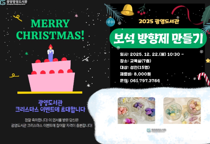 시민들이 자연스럽게 도서관을 방문해 독서 활동에 참여하도록 체험 프로그램도 함께 운영한다. 12월 22일 열리는 '크리스마스 원데이 클래스'는 성인 대상 프로그램으로, 크리스마스 분위기를 담은 보석 방향제 만들기 체험으로 진행된다.