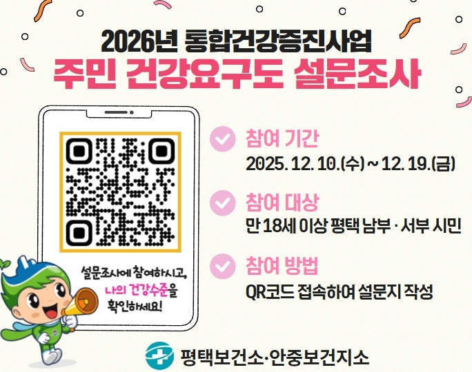 [메이저뉴스]평택시 평택보건소는 10일부터 오는 19일까지 지역사회 주민 500명을 대상으로 2026년 통합건강증진사업 계획 수립을 위한 ‘주민 건강요구도 조사’를 시행 중이라고 밝혔다.