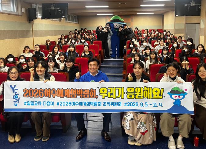 [메이저뉴스](재)2026여수세계섬박람회 조직위원장 정기명 여수시장이 섬박람회를 알리기 위해 여수 중앙여자고등학교에 일일교사 다섬이로 나섰다.