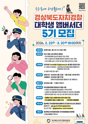 [메이저뉴스]경상북도자치경찰위원회는 대구⋅경북 지역 대학생을 대상으로 2월 23일부터 3월 20일까지 ‘경북자치경찰 대학생 앰버서더 5기’를 모집한다고 밝혔다.