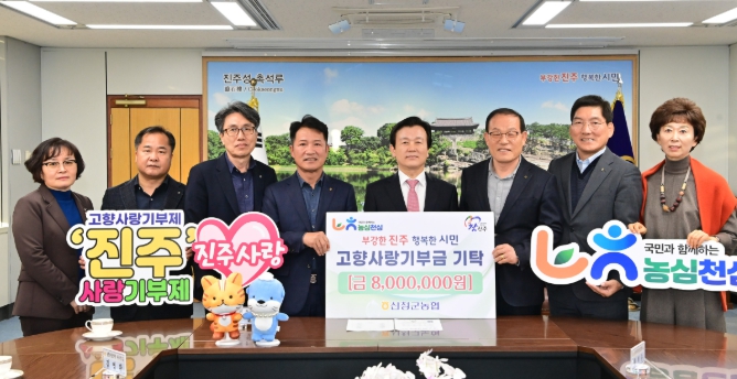 [메이저뉴스]진주시는 3일 시청 기업인의 방에서 산청군농협 임직원 80여 명이 동참한 고향사랑기부금 800만 원을 기탁받았다고 전했다.