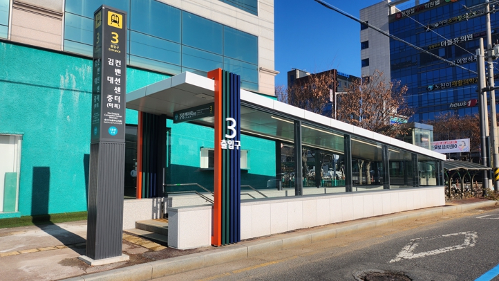 [메이저뉴스]광주도시철도 1호선 김대중컨벤션센터역(마륵역)과 남광주역의 역사 외부 캐노피가 시인성 높은 표준 디자인으로 새단장을 마쳤다.