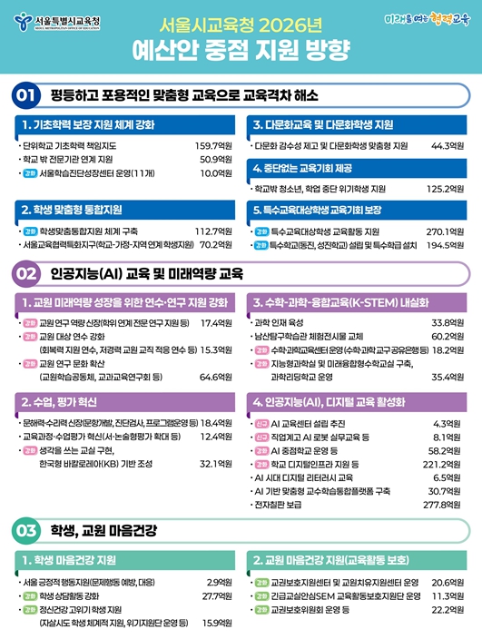 세출 예산은 △맞춤형 교육으로 교육격차 해소 △AI 교육 등 미래역량교육 강화 △학생·교원 마음건강 증진 △다양한 공교육 강화 △안전하고 행복한 학교 지원에 중점을 두었다.