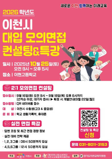 [메이저뉴스]이천교육지원청은 10월 25일 이현고등학교에서 ‘2026학년도 이천시 대입 모의면접 컨설팅 및 특강’을 운영한다.