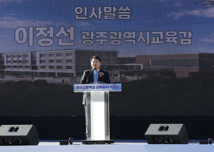 | ▲ 이정선 광주시교육감이 22일 광산구 하남동 135번지에서 진행한 ‘광산고등학교 신축공사 착공식’에서 인사말을 하고 있다. / 광주시교육청 제공 |