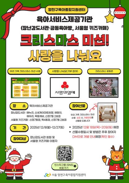 [메이저뉴스]양천구는 크리스마스를 맞아 관내 장난감도서관 및 서울형 키즈카페 이용 가족을 대상으로 ‘2025 크리스마스 미션! 사랑을 나눠요’ 이벤트를 12월 8일부터 27일까지 운영한다고 밝혔다.