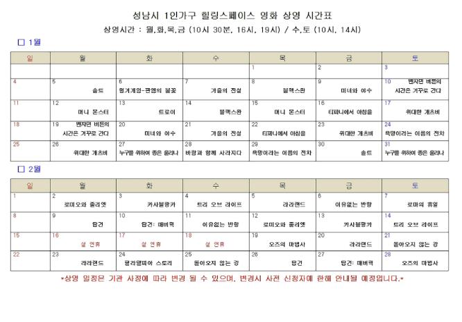 [메이저뉴스]성남시는 오는 2월 28일까지 1인 가구 힐링 스페이스 커뮤니티 홀(중원구 둔촌대로 100 4층)에서 ‘추억의 할리우드 영화’를 총 120회 무료 상영한다.