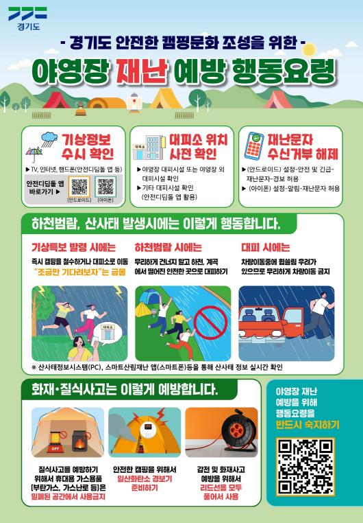 [메이저뉴스]경기도는 예측이 어려운 기상상황에 대비해 야영장 이용객의 신속한 대피를 돕기 위한 행동요령 홍보물 10만 8천 부를 제작해 야영장 등에 배포했다고 22일 밝혔다.
