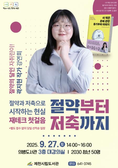 [메이저뉴스]제천시립도서관은 오는 27일 오후 2시, 의병도서관 3층 대강의실에서 곽지현 작가 초청 강연 '절약부터 저축까지'를 개최한다.