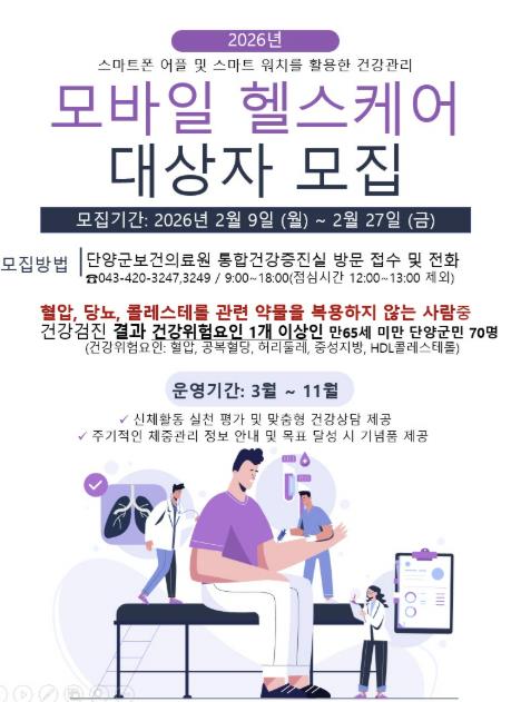[메이저뉴스]단양군은 군민의 만성질환 예방과 건강생활 실천을 지원하기 위해 ‘2026년 모바일 헬스케어 사업’ 대상자를 오는 27일까지 모집한다.