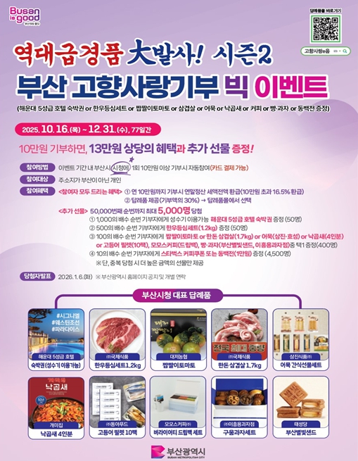 [메이저뉴스]부산시는 지난 10월 16일부터 진행 중인 '역대급 경품 대발사 시즌2! 부산 고향사랑기부제 연말 빅 이벤트'에 많은 동참을 당부했다.