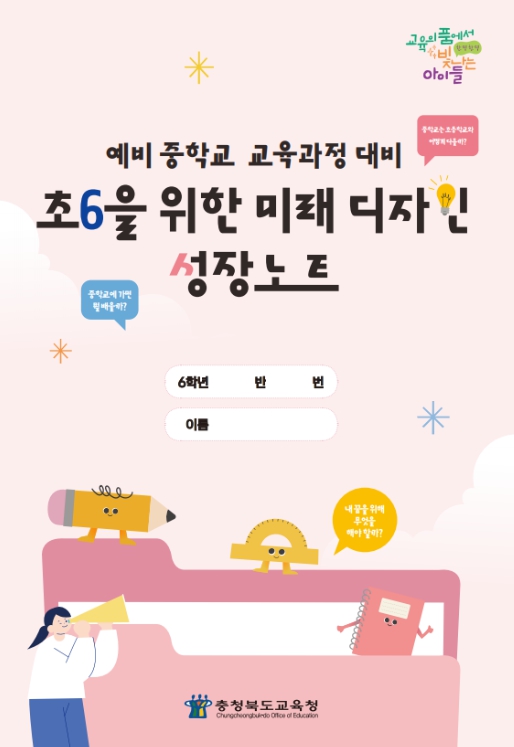 [메이저뉴스]충청북도교육청은 초등학교 6학년 학생들의 중학교 진학 준비와 진로 설계를 돕기 위해〈예비 중학교 교육과정 대비 초6을 위한 미래 디자인 성장노트'를 제작해 도내 모든 초등학교에 책자로 보급했다고 밝혔다.