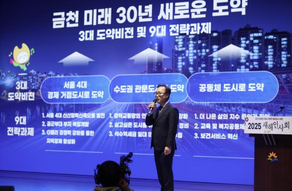 ▲ 유성훈 금천구청장이 2025 새해인사회 행사에서 ‘금천 미래 30년’을 발표하고 있다. |