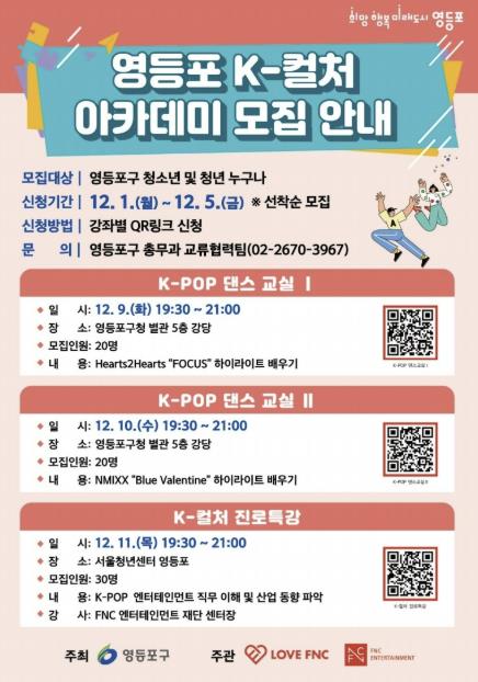 [메이저뉴스]영등포구가 글로벌 K-컬처에 관심 있는 청소년과 청년을 대상으로 ‘댄스교실’과 ‘진로특강’으로 구성된 ‘영등포 K-컬처 아카데미’를 운영하고, 참가자를 모집한다고 밝혔다.