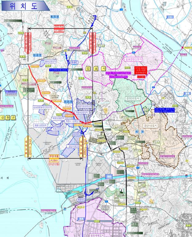 ‘국지도 84호선 초지대교~인천간 도로건설공사’는 김포시 대곶면 대명리와 양촌읍 대포리를 연결하는 총 길이 7.88km, 폭 20~27m(4~6차로), 교차로 8개소(지하차도 1개소), 교량 7개소를 신설하는 사업으로 총사업비 2,538억원이 투입됐다.