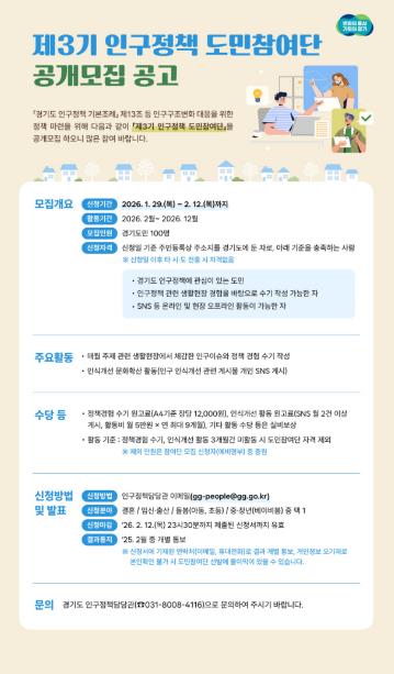 지원 대상은 신청일 기준 주민등록상 주소지가 경기도인 도민으로, 인구정책에 관심이 있고 생활현장 경험을 바탕으로 수기 작성이 가능하며 온라인·오프라인 활동이 가능한 사람이다.