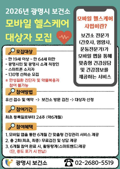 | ▲ 2026년 광명시 보건소 모바일 헬스케어 대상자 모집 안내문. |