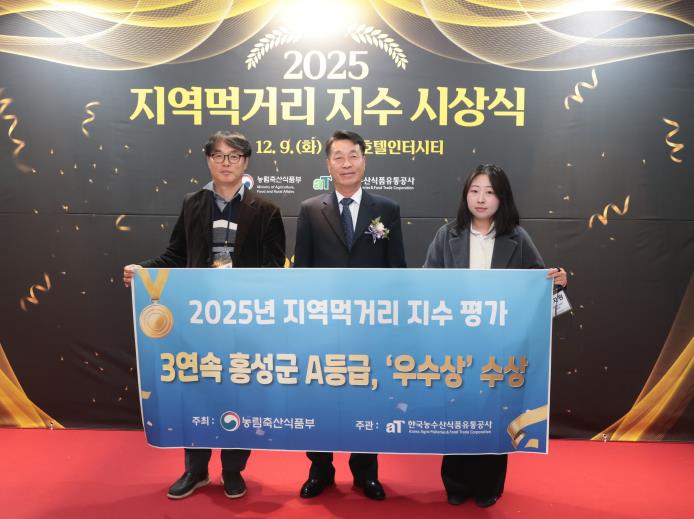 [메이저뉴스]충남 홍성군은 지난 9일 농림축산식품부가 주최하고, 한국농수산식품유통공사에서 주관하는 ‘2025년 지역먹거리 지수 평가’에서 3년 연속 A등급을 달성, “우수상”(한국농수산식품유통공사 사장상)을 수상하며 지역먹거리 정책 우수 지자체로서의 위상을 굳건히 했다고 밝혔다.