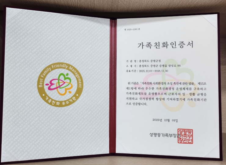| ▲ 증평군 ‘가족친화 인증기관’ 5회 연속 재인증 |