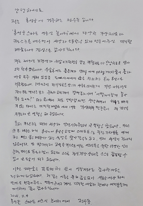 전 씨는 편지를 통해 “하루도 빠지지 않고 다니는 디지털배움터에서 배운 가상 체육 활동들이 제 건강을 지키는 데 큰 역할을 해줬다”라면서 “특히 키오스크를 배운 뒤 직접 기차표를 예매하고 먹고 싶은 메뉴가 있는 식당을 찾아갈 수도 있었다. 이제 세상이 겁나지 않는다”라고 전했다.