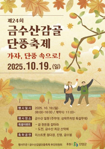 ‘가자, 단풍 속으로!’를 슬로건으로 한 이번 축제는 금수산의 오색 단풍을 배경으로 산행·공연·체험·먹거리가 어우러진 풍성한 프로그램을 선보인다.
