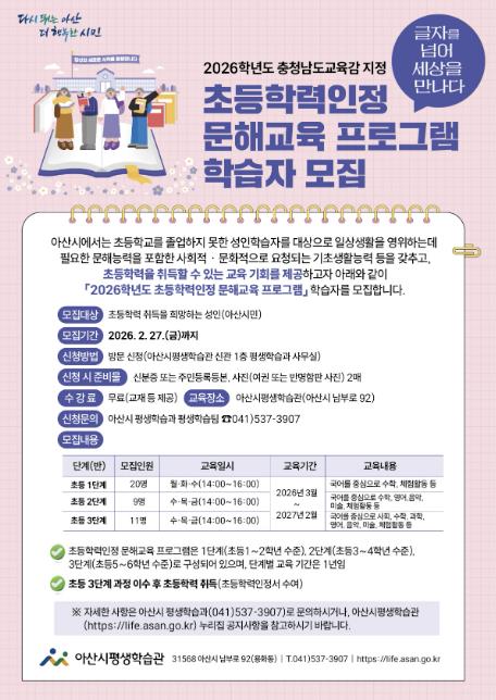모집 대상은 아산시민 중 초등학력 취득을 희망하는 성인으로, 신청은 오는 2월 27일까지 아산시평생학습관(아산시 남부로 92)을 직접 방문해 신청하면 된다.