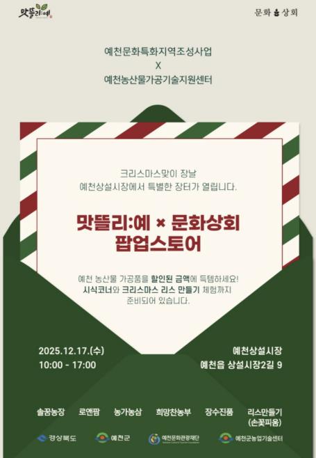[메이저뉴스]예천군과 예천문화관광재단은 17일, 예천상설시장 ‘문화상회’에서 크리스마스를 맞아 ‘문화상회 X 맛뜰리:예’ 프로그램을 개최한다.