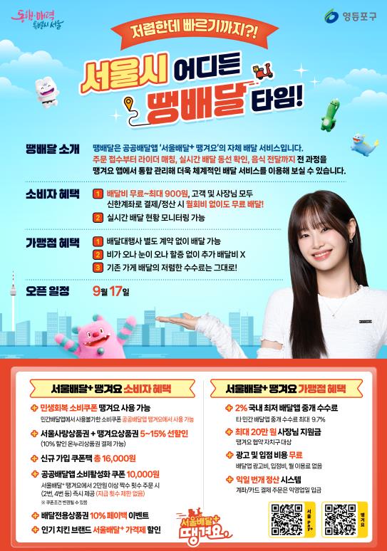 최호권 영등포구청장은 "'땡배달'은 소상공인과 소비자 모두의 비용 부담을 해소하고, 지역 경제에 활력을 불어넣는 착한 배달 서비스”라며 “영등포 구석구석을 누비며 행복을 전하는 한 끼 친구로 자리 잡길 기대한다”라고 전했다.