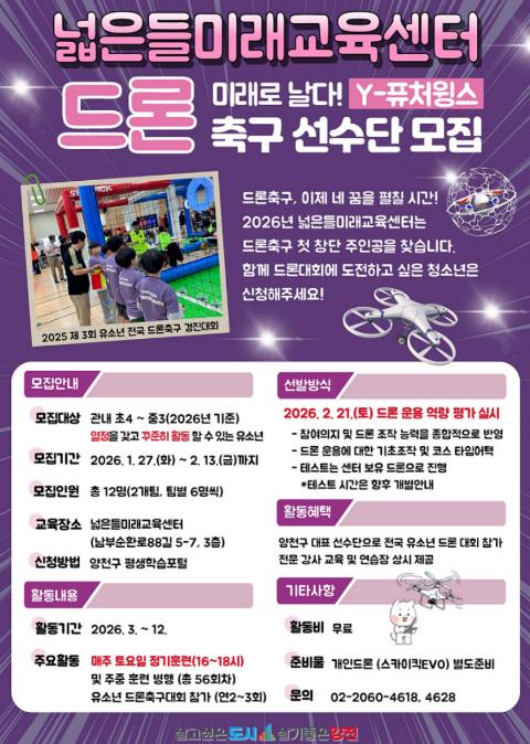 이기재 양천구청장은 “드론축구는 미래 기술과 스포츠가 결합된 융합형 기술 교육 분야로, 청소년들이 흥미와 진로를 함께 확장할 좋은 기회가 될 것”이라며 “넓은들미래교육센터를 거점으로 체계적인 선수 양성 시스템을 구축해 양천구를 대표하는 미래형 스포츠 교육 모델로 발전시켜 나가겠다”고 말했다.